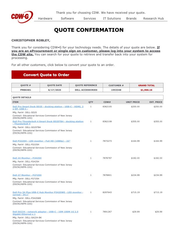 34″ External Monitor | Dell Pro 34 Plus USB-C Hub Monitor P3425WE – LED monitor – curved – 34.1″ | DELL-P2725H | 8297643 | 1 HDMI 1 DisplayPort 1 VGA | Built-in Camera: No Built-in USB Hub: Yes | $715.99 |